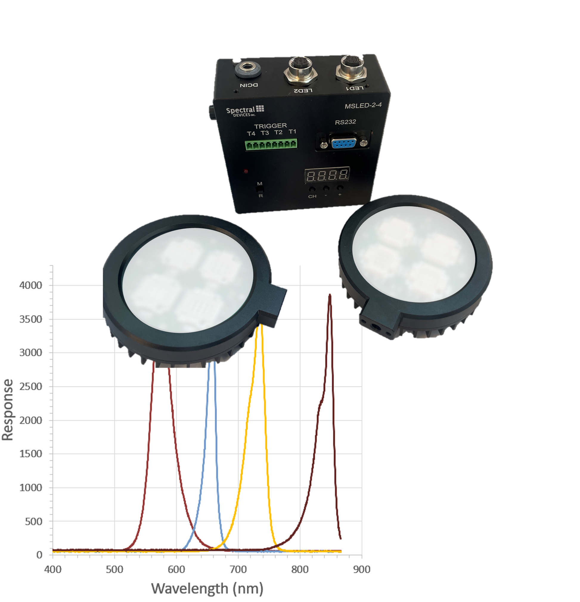 The MSLED-AGRI-2-4 consists of two LED modules each equipped with four independent LED channels. The four channels include: (i) 580 nm, which is specific to live vegetation, (ii) 660 nm, which is specific to the NDVI red channel, (iii) 735 nm, which is specific to the "red edge" channel, and (iv) 820 nm, which is specific to the NDVI NIR channel.