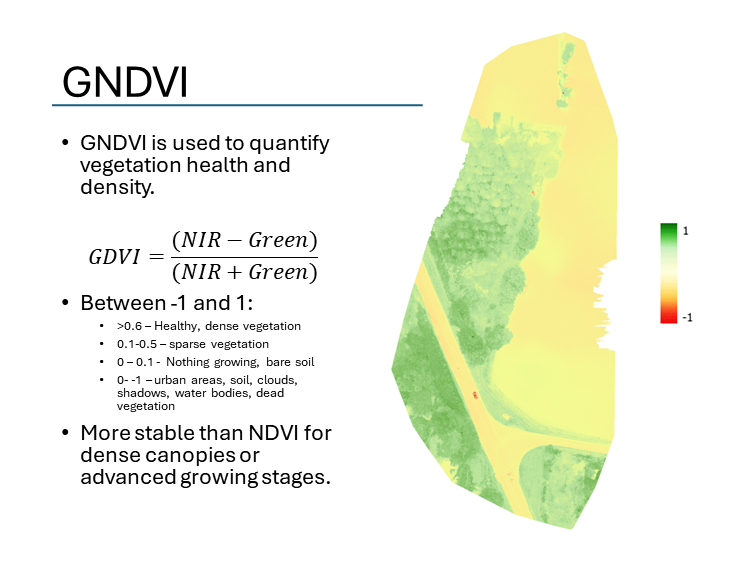 - The GNDVI is similar to NDVI and is known to perform better in presence of more dense vegetation. By comparing the NDVI and GNDVI maps it can be seen that the dynamic range of denser areas has increased.