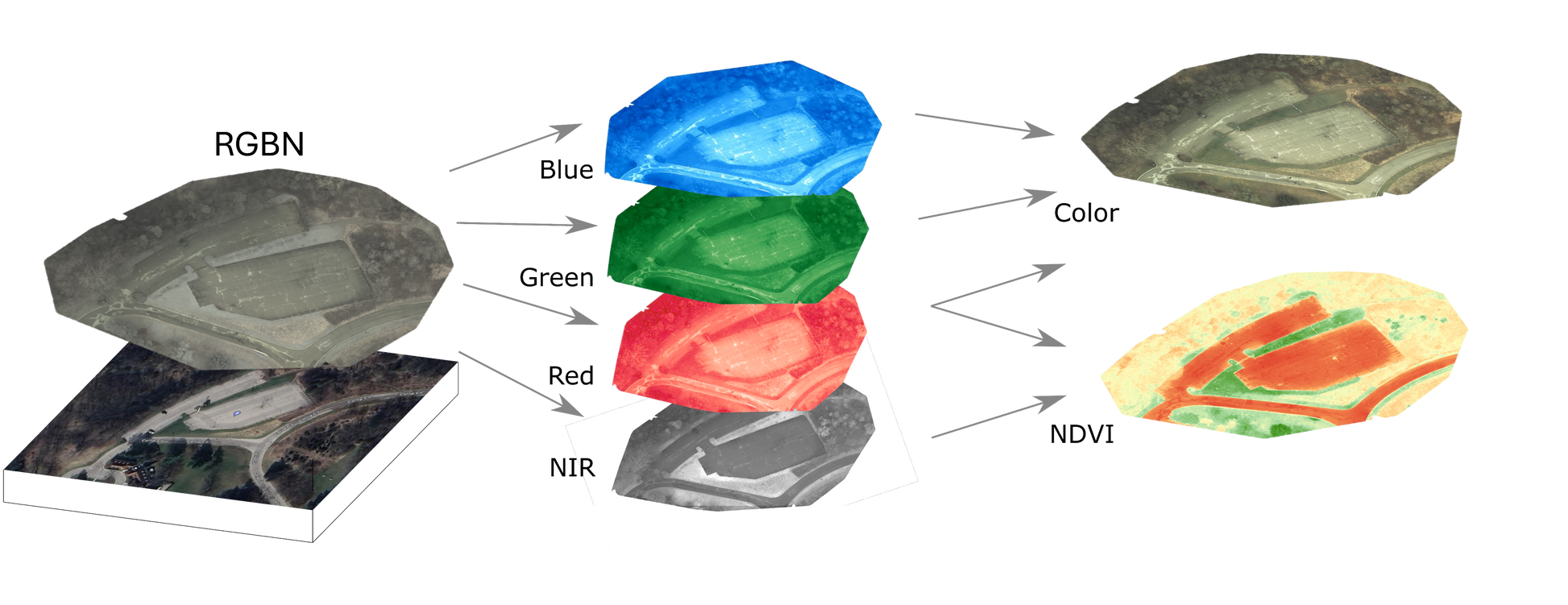 The Open Drone Maps software WebODM was used to reconstruct multispectral orthomap. As an output GeoTiff file of the orthomosaic map is provided containing all the spectral bands. For visualization and manipulation of each spectral band the QGIS software was used. Several standard metrics were applied to the available image bands: