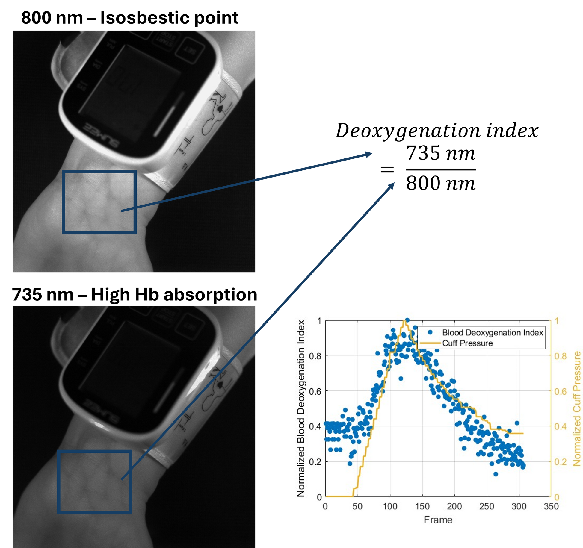 When blood circulation is restricted the light reflectance at the isosbestic point is expected to remain relatively stable, as the total blood volume doesn't change. This will further lead to Hb level increase and HbO2 level decrease as tissue keeps consuming the oxygen present in the blood. Therefore, a ratio between light reflectance at 735 nm, representing Hb absorption, and the reflectance at the isosbestic point at 800 nm, representing all blood absorption, should provide an indication of blood deoxygenation level.