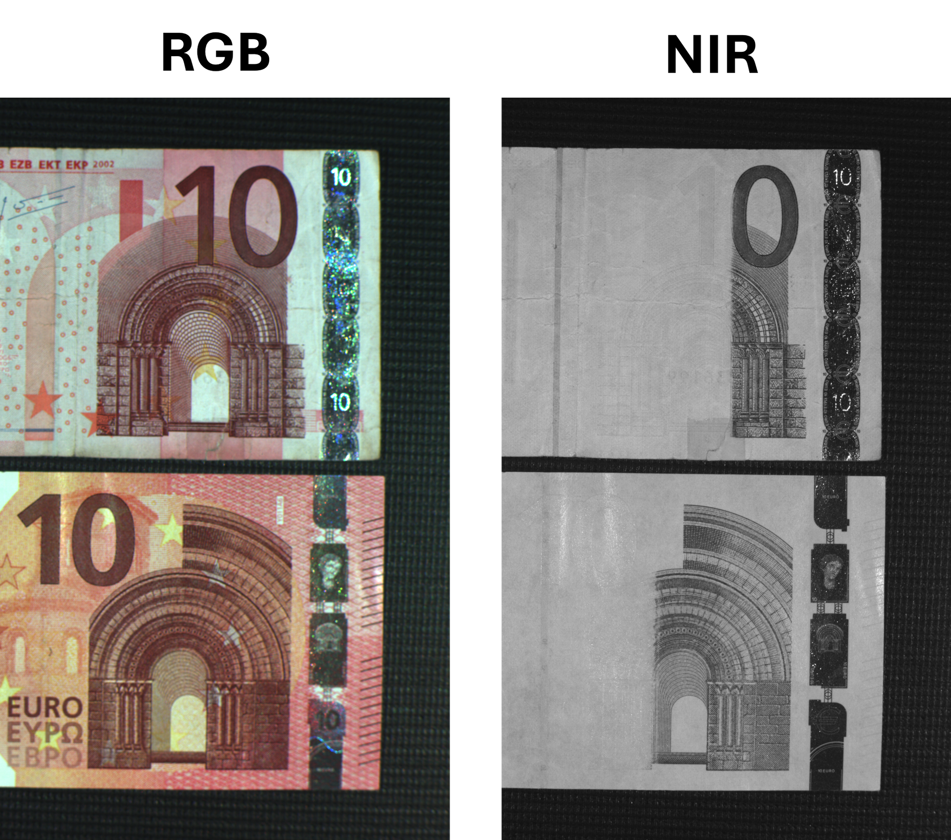 Using the NIR illumination at 850 nm, the invisible features to the naked eye are unveiled. Note how the lack of visible light in NIR images hides all the features printed using visible spectrum inks.