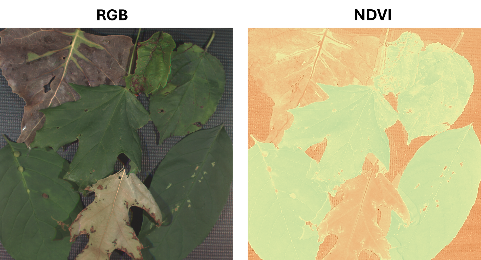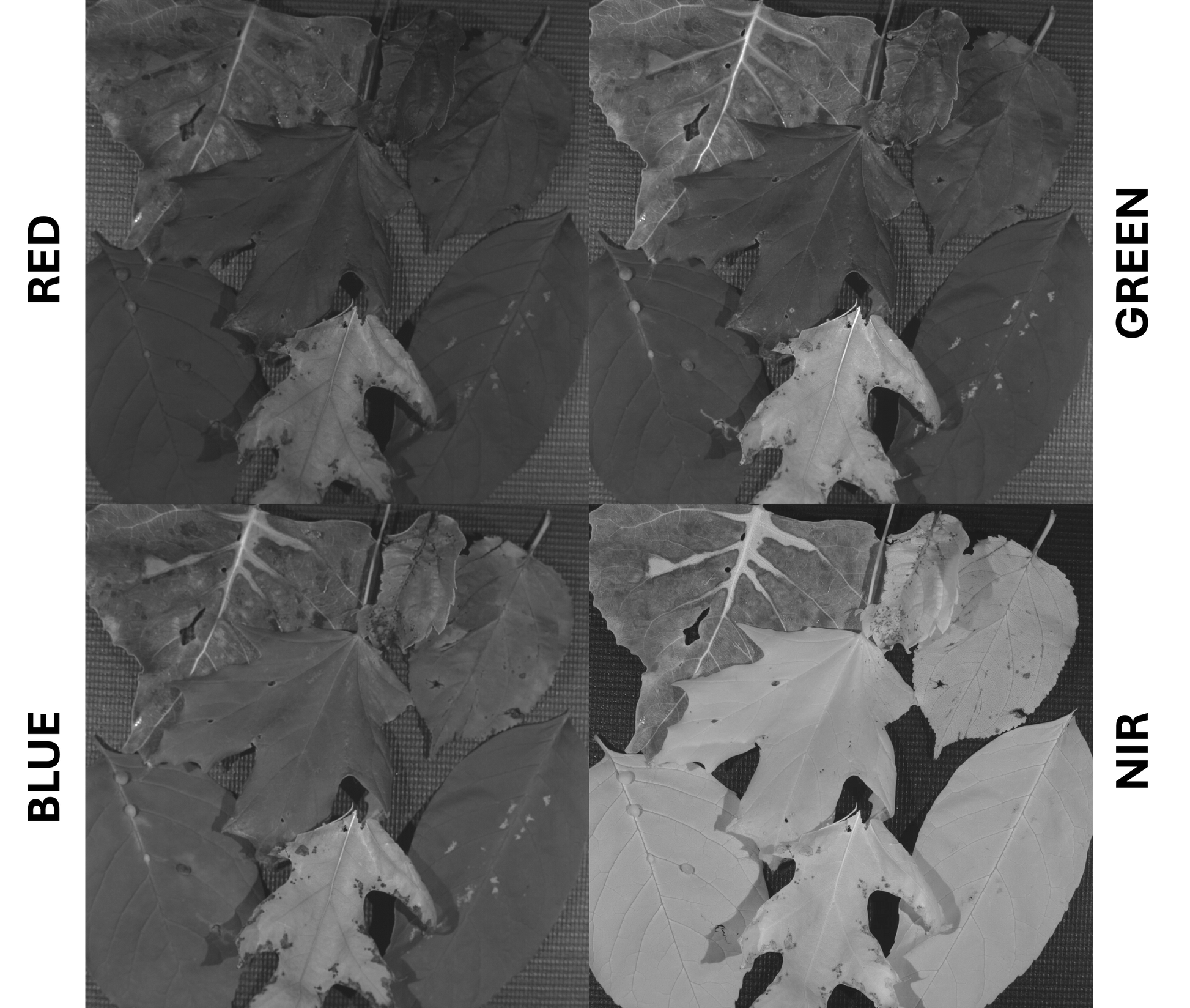 Images of a number of leaves both visibly healthy and with defects were taken using a MSLED-RGBN-2-4 illuminator with four spectral channels (red (620 nm), green (520 nm), blue (470 nm), near-infrared (850 nm)) and a monochrome 4.2 MP camera, MSC2-M42-1-A. The images obtained using red, green and blue light were merged to form a typical color (RGB) image. The NDVI index was calculated by (Red-NIR)/(Red+NIR).